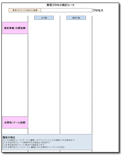 その手順を洗い出すためのシートが、以下の業務プロセス検討シートになります。