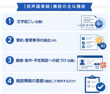 本機能により、営業担当者はこれまで手作業で行っていた商談記録の入力から解放され、顧客との関係構築や提案活動といった本来業務に集中できるようになります。