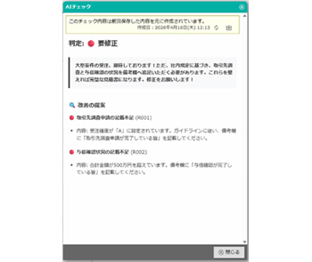 こうしたルールを「Sales Quote Assistant」に登録すると、AIが見積書を自動でチェックします。申請前にミスを検知できるため、差し戻しの手戻りや不備のままの見積提出を大幅に削減できます。
