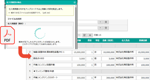 仕入見積書をアップロードすると、商品名・数量・金額をAIが読み取り、見積明細に転記します。あとは販売価格を入力するだけで見積書が完成します。仕入先や外注先ごとに異なる見積書式にも対応し、複数社の仕入見積書をまとめて1件の自社見積書に変換することも可能です。