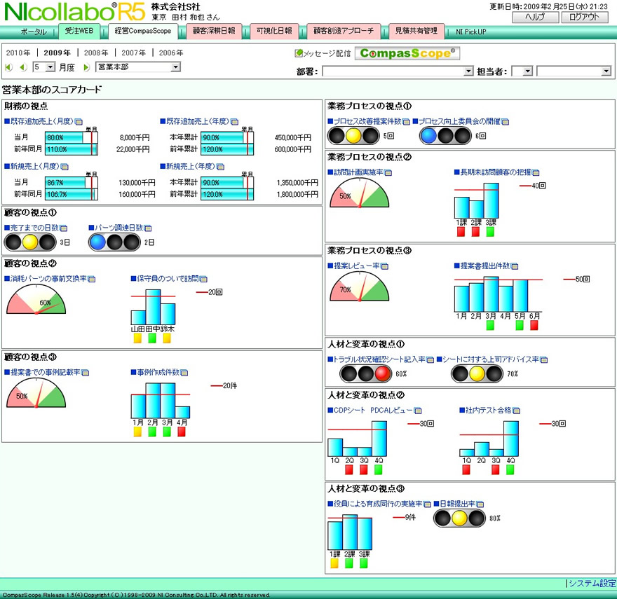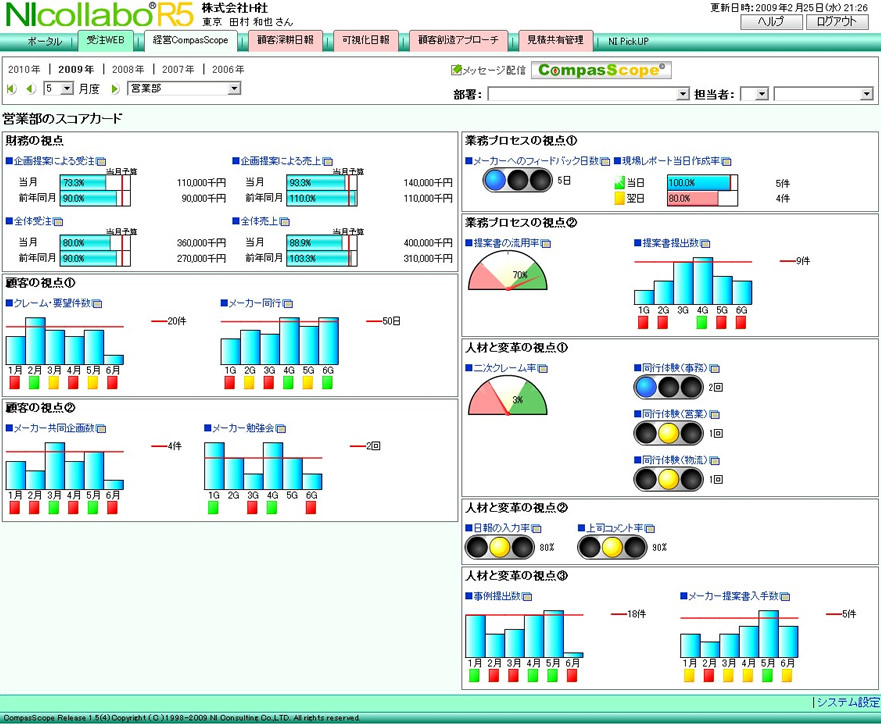 パッと見ただけで、複数の情報を把握でき、経営状況の異変、現場の動向や変化を察知することができます。 社内の財務情報はもとより、営業活動情報、社外の顧客状況、クレーム情報、競合情報など、 経営判断に必要なあらゆる情報を一覧でチェックできる「経営判断支援ツール」です。
